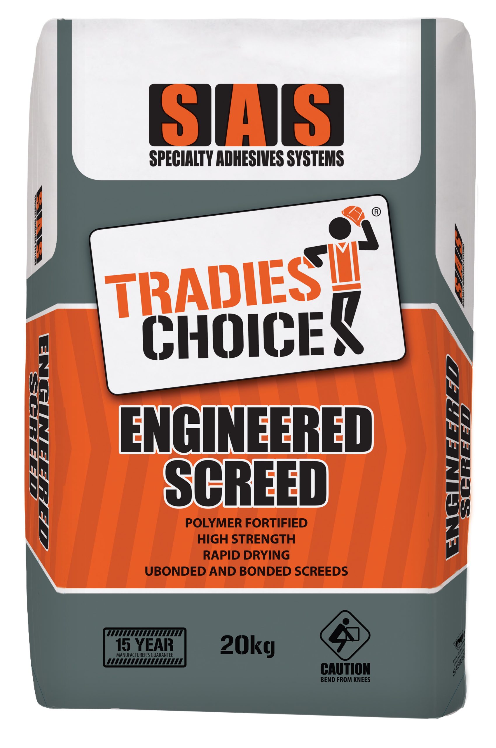 Tradies choice Engineered screed is a ready mixed cementitious mortar made up of special hydraulic binders, organic additives and aggregates with selected and controlled granulometry. The product is characterised by normal setting times, fast drying and controlled shrinkage.